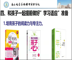 倪老师以一段视频进行导入,让家长了解陪伴的重要性,不禁引人深思。接着,结合自己在一线数十年的研究成果,和一例例生动鲜活的实例,深入浅出地分享了家长和孩子应该在入学前一起做好的各项适应性准备,以及如何帮助找到孩子处理问题的方式和方法,同时还分享了多本促进幼小衔接工作的书籍;例如:《好妈妈胜过好老师》、《别以为你懂孩子的心》等。